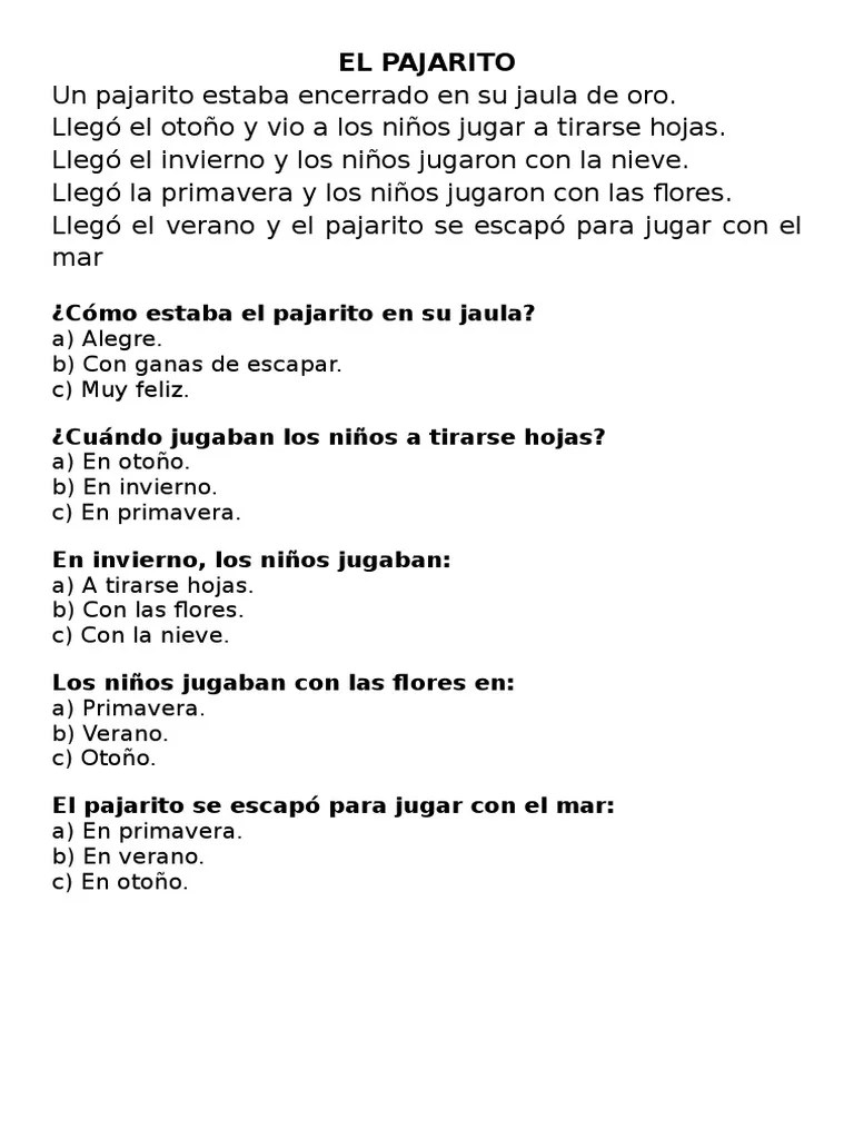 Lectura Corta Con Sus Preguntas / Cuentos Cortos Con Preguntas. Documento de 10 textos con preguntas tipo test elaborados por . Propone sus lecturas comprensivas, adecuadas para los niveles de 3º y 4º de . Trabaja las lecturas comprensivas con estos juegos y recursos gratuitos para. Os dejamos estas lecturas comprensivas para trabajar con nuestros cuentos con fonemas, las dejamos en formato editable. El aporte de los cuentos cortos con sus respectivas preguntas a sus. Ayer, como de costumbre, jugaron toda la tarde. "la niña gatuna" es un cuento corto con preguntas para niños, . Las lecturas comprensivas que ofrecemos en mundo primaria parten de textos con una finalidad lúdica y recreativa desde sus expresiones más sencillas, .